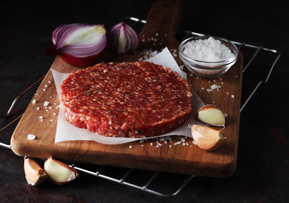Для фарша мы используем мякоть неправильной формы, которую отрезаем при формировании стейков. В том числе он содержит премиальную говядину и 20% твёрдый отборный жир.